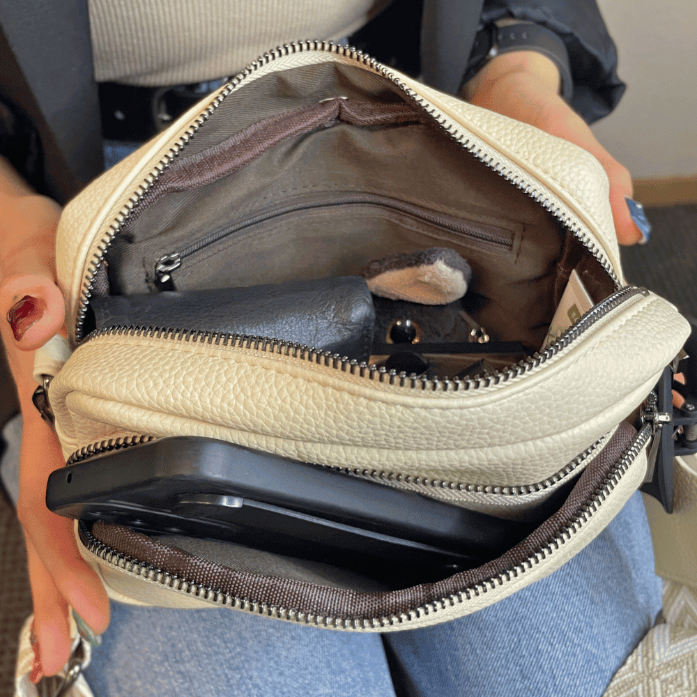 Die Umhängetasche verfügt über drei Hauptfächer sowie zusätzliche Innentaschen und Reißverschlusstaschen, um deine Gegenstände organisiert zu halten.